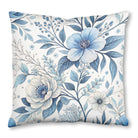 This is a delicate and intricate floral pattern featuring blue and white flowers, leaves, and berries. Rendered in a watercolor and ink-line style against a white background, the design creates a timeless and elegant botanical illustration.