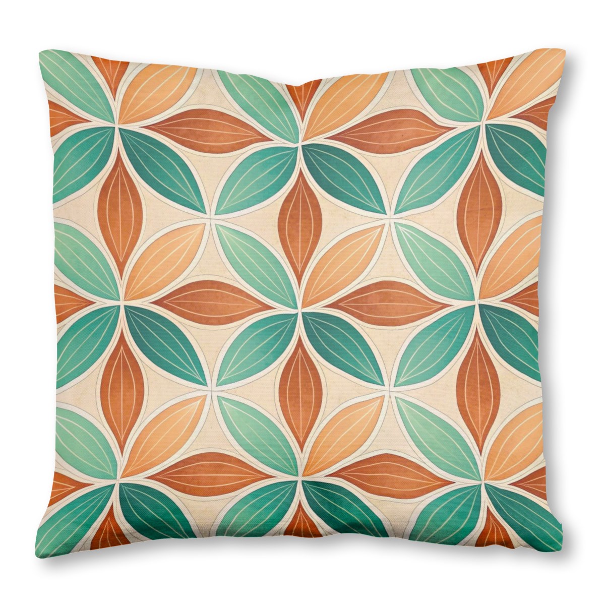 A retro geometric pattern featuring stylized flowers with alternating teal and terracotta-orange petals. The seamless design is set on a cream, textured background, creating the look of vintage ceramic tiles with a mid-century modern aesthetic.