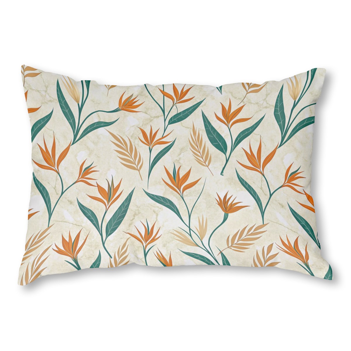 This image displays a seamless botanical pattern featuring stylized Bird of Paradise flowers. The orange, tan, and dark green plants are set against a light, creamy background with a subtle marbled texture, creating an elegant and modern tropical design.