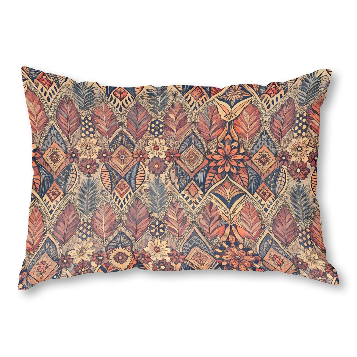 This is an intricate, hand-drawn bohemian pattern featuring a dense tapestry of feathers, flowers, and geometric motifs. The rich, earthy color palette of rust, orange, and navy blue creates a vibrant, folk-art-inspired design with a rustic feel.