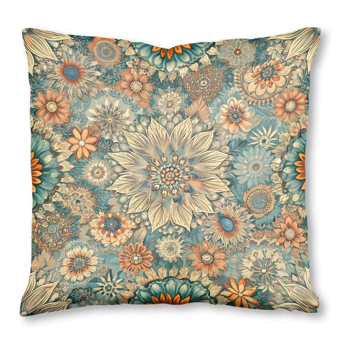 A dense, retro-style floral pattern features intricately detailed flowers. The busy, repeating design uses a striking color palette of teal, orange, and cream, creating a rich and decorative visual tapestry with a vintage, illustrative feel.