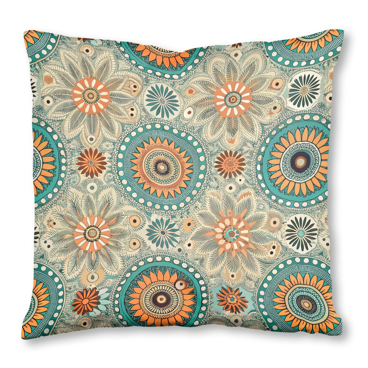 This is a vibrant, repeating pattern featuring intricate mandalas and stylized flowers in a bohemian, folk-art style. The design uses a striking color palette of teal, orange, and cream, with detailed line work and dotted textures creating a rich, layered effect.