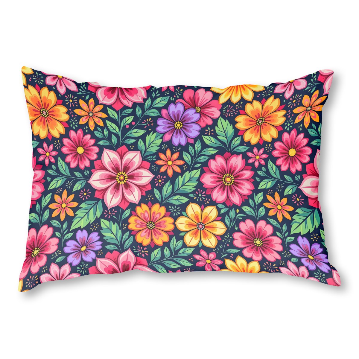 A vibrant, seamless pattern of stylized folk-art flowers. The bold, colorful blossoms in shades of pink, orange, and purple, along with green leaves, stand out against a dark navy background, creating a dense and cheerful composition.