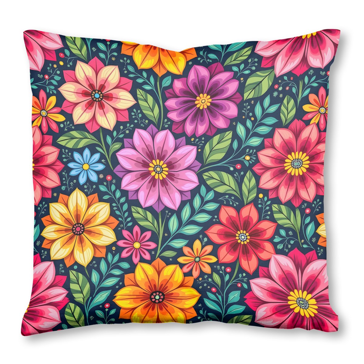 A vibrant, seamless pattern of stylized flowers in a folk art style. Bold, colorful blossoms in shades of pink, orange, and purple pop against a dark navy background, intertwined with green leaves to create a dense and cheerful composition.
