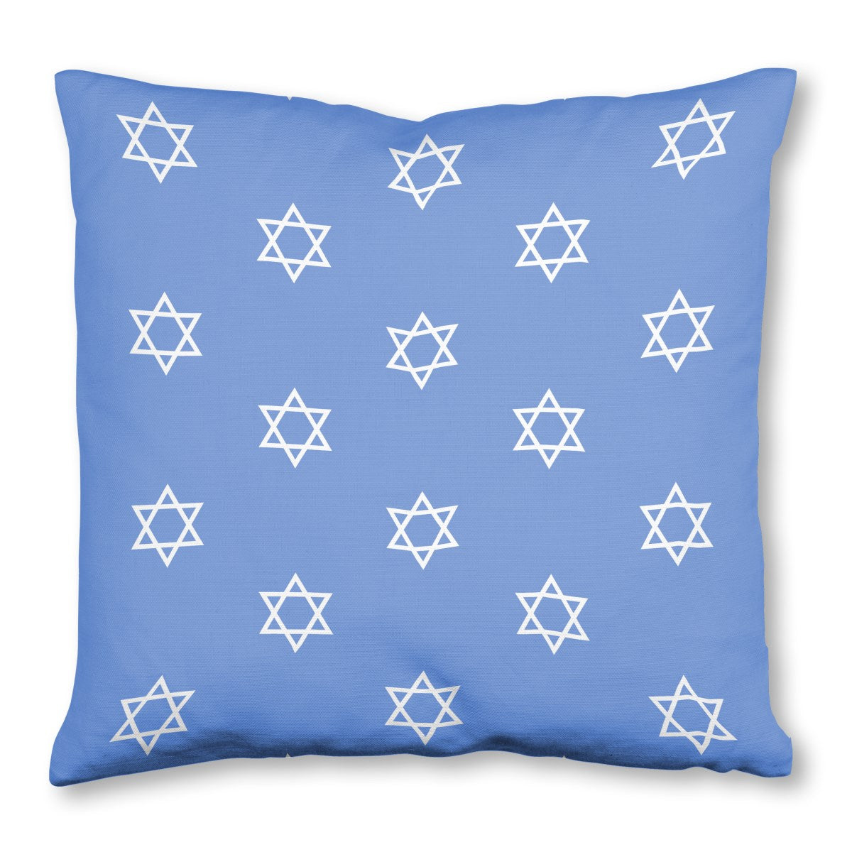 A seamless pattern features white Stars of David, a well-known symbol of Judaism, arranged in an orderly grid against a solid blue background.