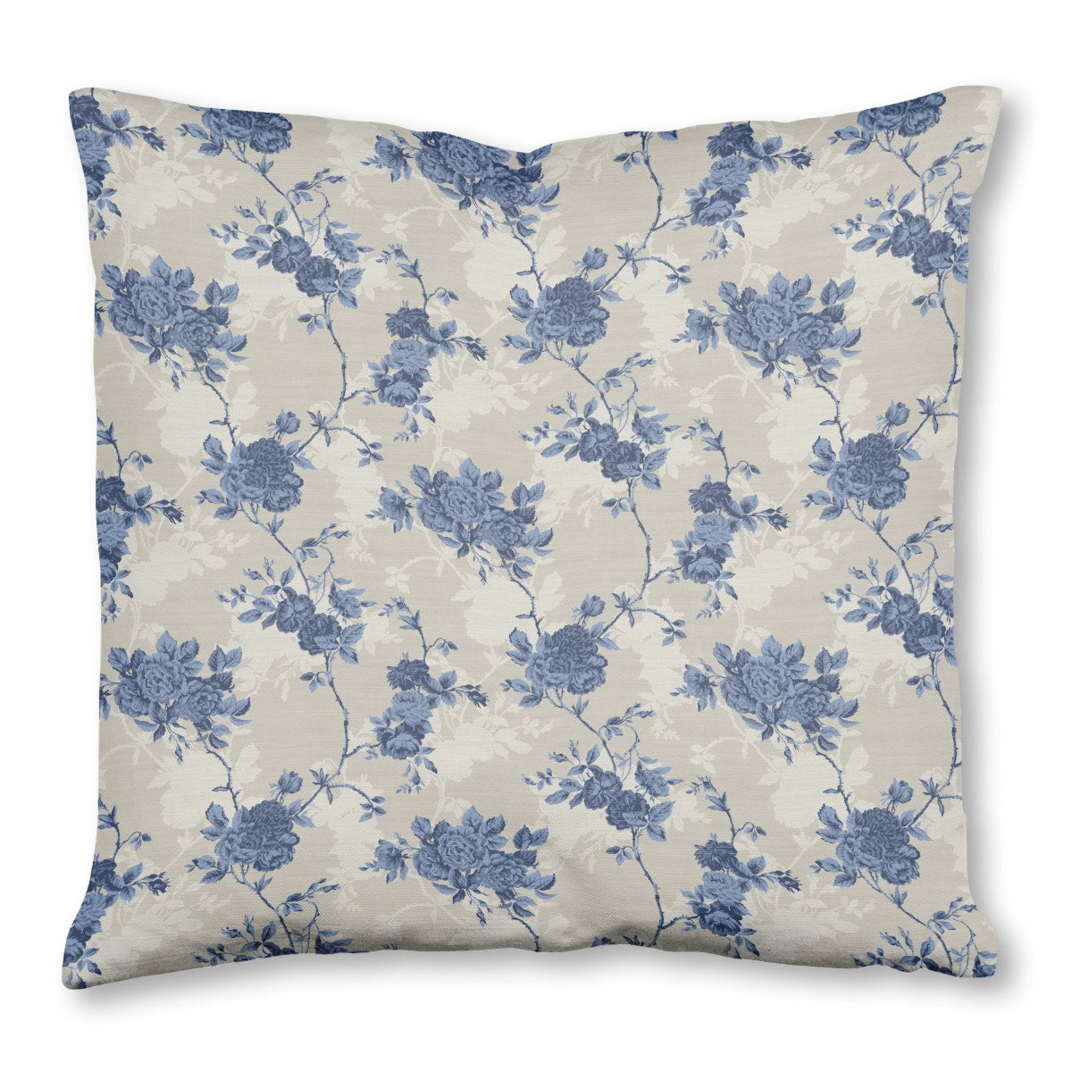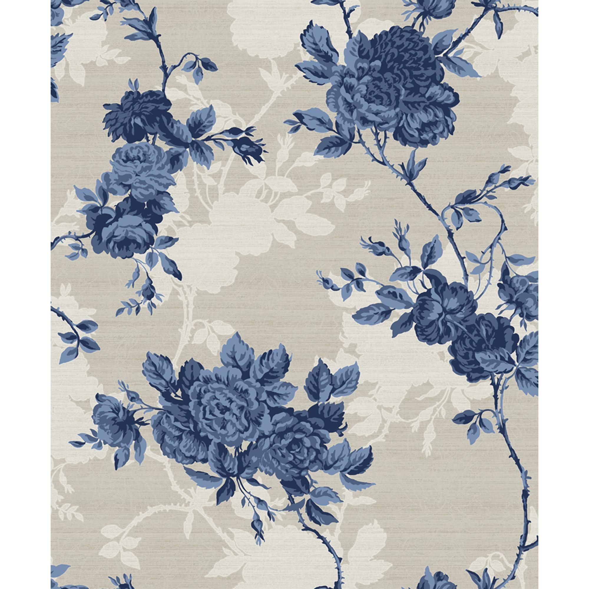 The image displays a seamless pattern of stylized blue roses on a beige background. The roses are densely clustered on thorny stems, with some buds and leaves interspersed. The background has a subtle linen-like texture. The overall style is reminiscent of classic floral toile patterns, suggesting a sophisticated and perhaps slightly traditional aesthetic.