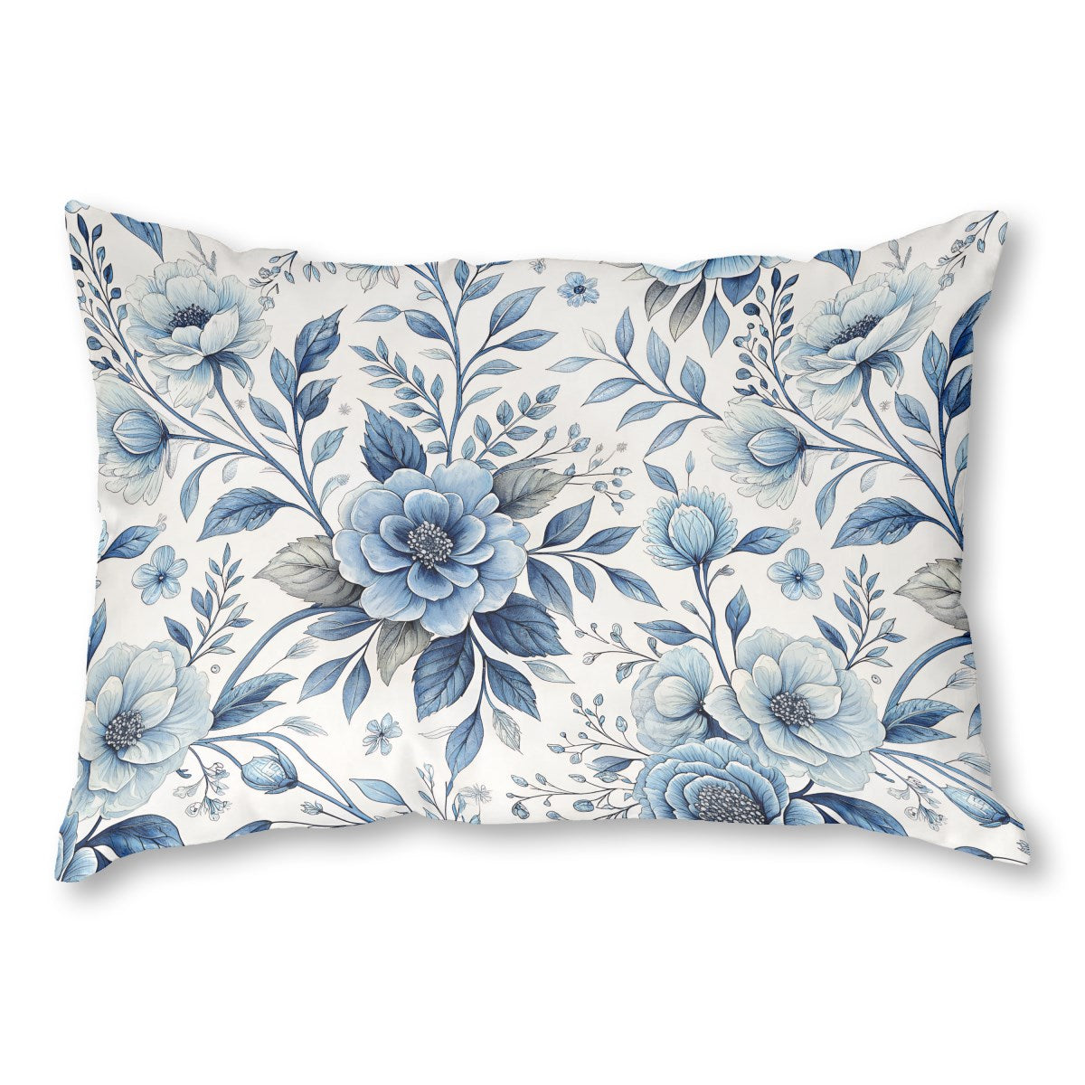 This image displays a seamless floral pattern with elegant, watercolor-style illustrations. Various blue flowers, from light to deep indigo, are intertwined with matching leaves and stems on a clean white background, creating a classic and delicate botanical design.