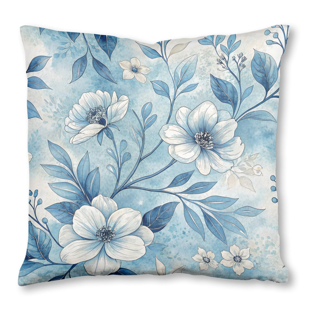 This watercolor illustration depicts a delicate floral pattern. White flowers with dark centers and deep blue leaves are intertwined on winding stems. The composition is set against a soft, mottled light blue background, creating a serene and elegant design.