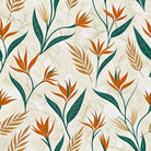 This image displays a seamless botanical pattern featuring stylized Bird of Paradise flowers. The orange, tan, and dark green plants are set against a light, creamy background with a subtle marbled texture, creating an elegant and modern tropical design.