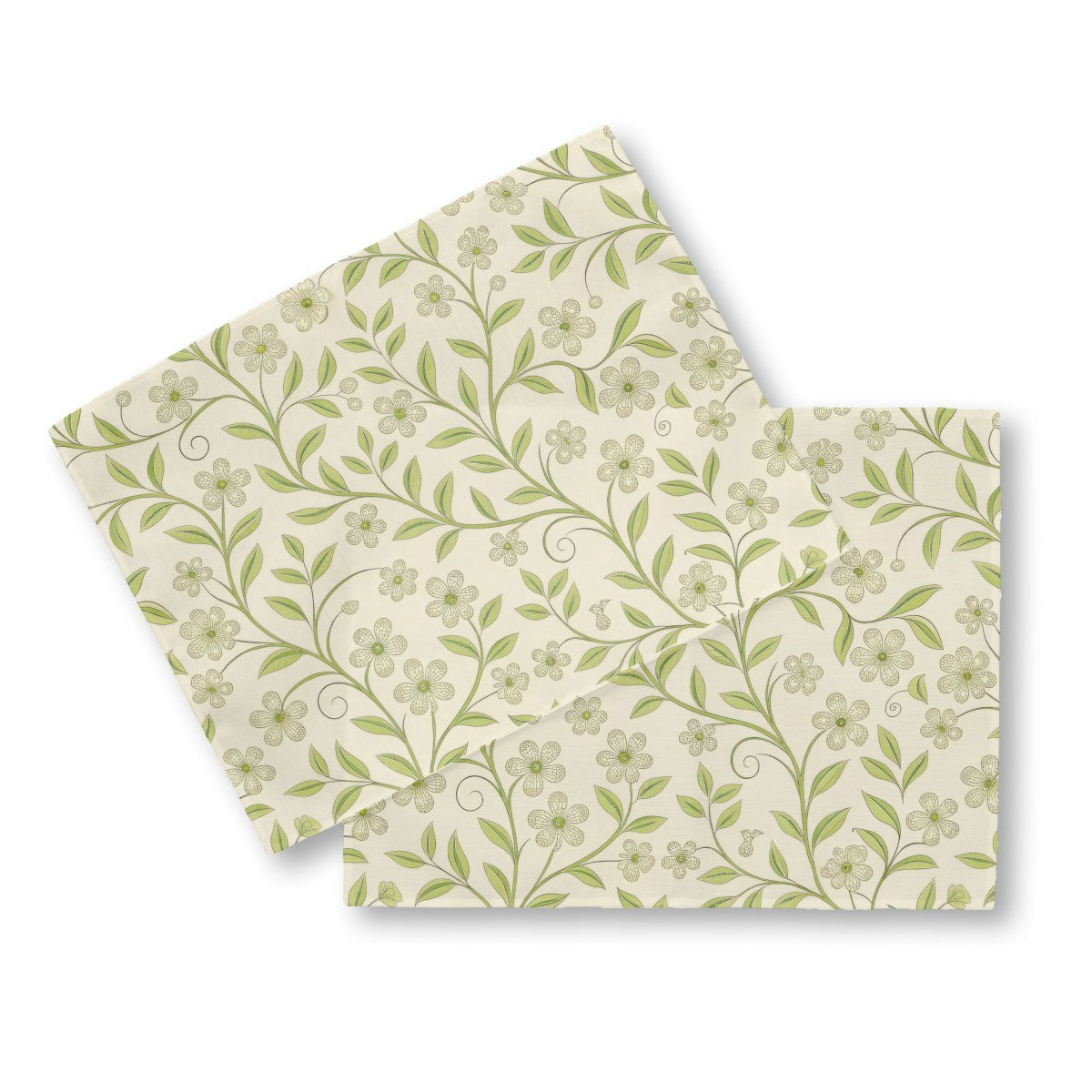 A delicate, vintage-style floral pattern featuring gracefully curving green vines and leaves on a cream background. The small white flowers have a distinctive, web-like texture on their petals, creating a charming and elegant design suitable for wallpaper or fabric.