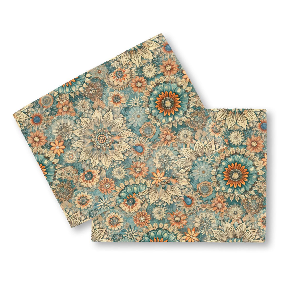 A dense, retro-style floral pattern features intricately detailed flowers. The busy, repeating design uses a striking color palette of teal, orange, and cream, creating a rich and decorative visual tapestry with a vintage, illustrative feel.