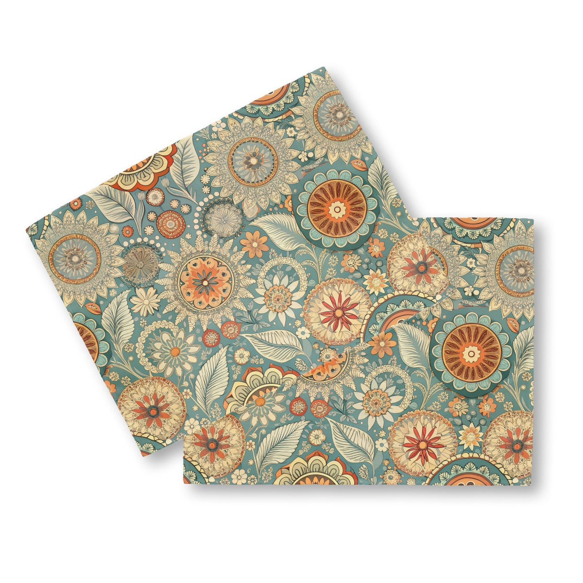 A vibrant, bohemian-style floral pattern featuring intricate, mandala-like flowers and stylized leaves. The rich color palette of teal, orange, and cream creates a warm, retro aesthetic on a dense, folk-art-inspired background.
