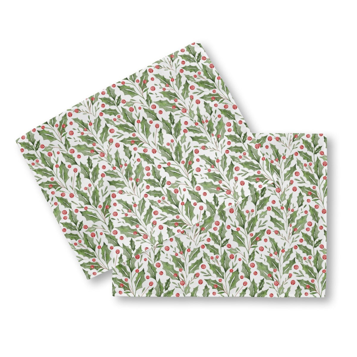 This is a seamless watercolor pattern of festive holly. Spiky green leaves and bright red berries are arranged in vertical sprigs against a white background, creating a classic and cheerful Christmas design.