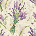This is a watercolor-style botanical pattern of purple lavender. Bouquets and loose sprigs are scattered across a textured, light beige background. A prominent bunch tied with a yellow ribbon creates a central focus in this charming, rustic design.