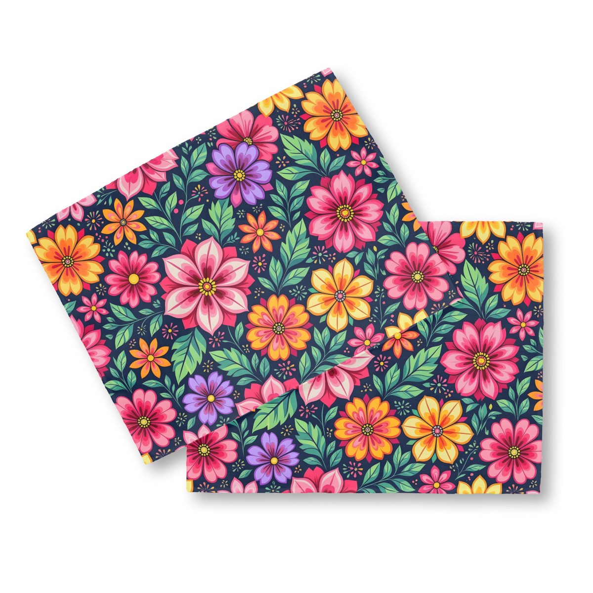 A vibrant, seamless pattern of stylized folk-art flowers. The bold, colorful blossoms in shades of pink, orange, and purple, along with green leaves, stand out against a dark navy background, creating a dense and cheerful composition.