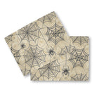 This vintage-style illustration features an intricate, repeating pattern of black spiderwebs on a textured, parchment-like background. Two detailed spiders are present, one crawling on a web and another dangling from a thread, creating a classic spooky or Halloween-themed design.