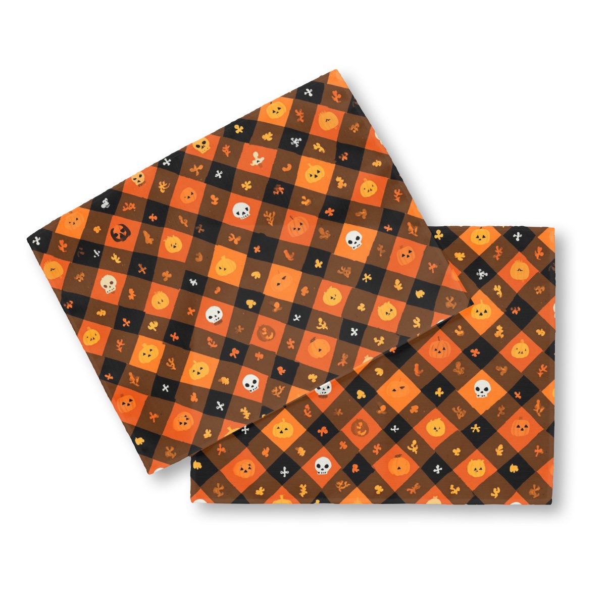 A whimsical, seamless Halloween pattern featuring a diagonal plaid in orange, black, and brown. The design is scattered with hand-drawn, cartoonish skulls, jack-o'-lanterns, and other small autumnal motifs, creating a festive and spooky-cute feel.