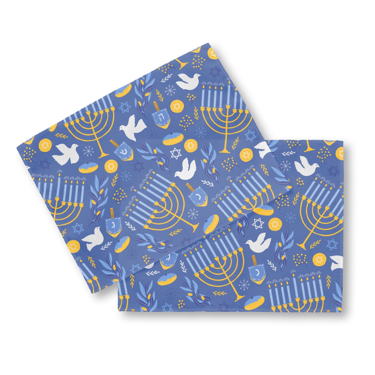 A festive, repeating pattern celebrating Hanukkah on a blue background. The design features illustrations of menorahs, dreidels, sufganiyot (doughnuts), Stars of David, and white doves in a cheerful yellow, blue, and white color palette, creating a joyful holiday theme.