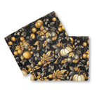 A luxurious, vintage-style pattern of autumnal fruits and foliage. Rendered in a detailed engraving style, golden pumpkins, apples, and grapes contrast richly with silver-toned leaves against a dramatic black background, creating an opulent and seamless design.