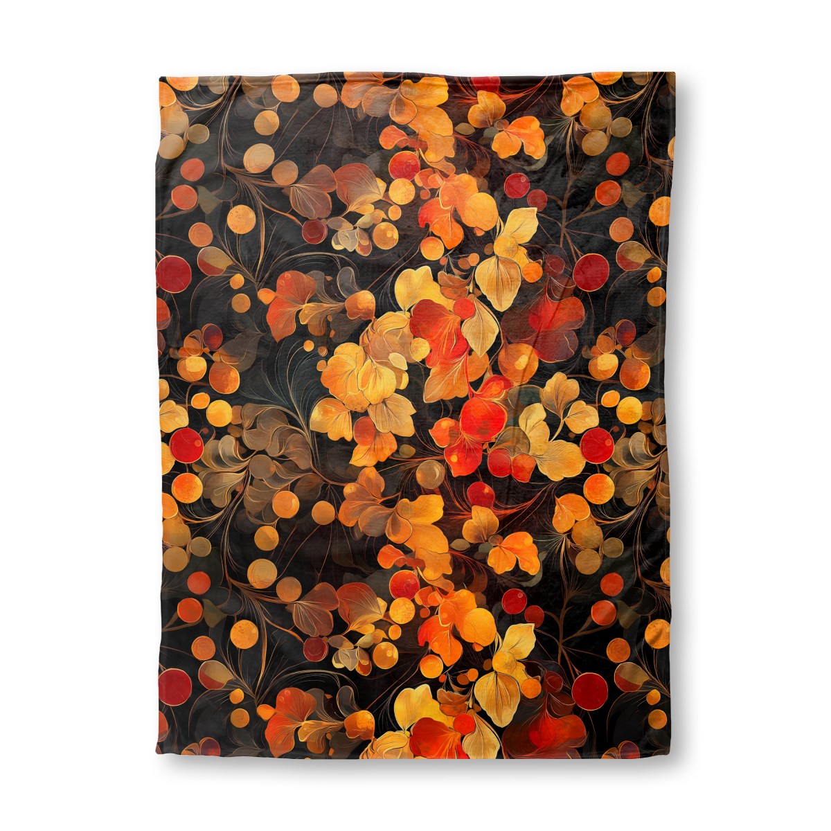 A vibrant, stylized botanical pattern features glowing leaves and berries in warm autumnal shades of orange, red, and yellow. The elegant, swirling elements are set against a dark background, creating a rich and dynamic composition with a painterly feel.