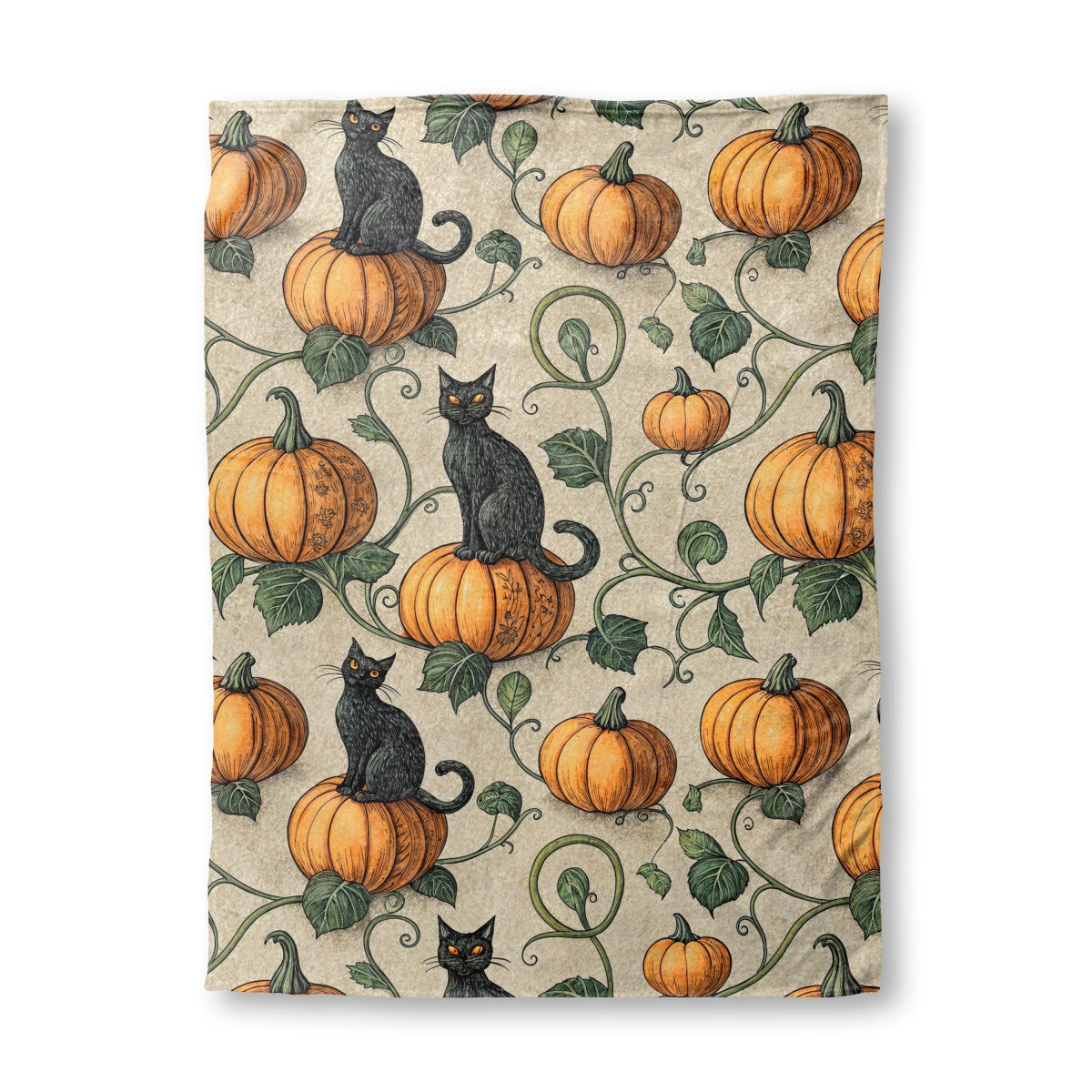 A vintage-style seamless pattern features black cats with glowing orange eyes perched on pumpkins. Swirling green vines and leaves connect the elements on a textured, light background, creating a classic Halloween-themed illustration with a slightly spooky feel.