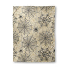 This vintage-style illustration features an intricate, repeating pattern of black spiderwebs on a textured, parchment-like background. Two detailed spiders are present, one crawling on a web and another dangling from a thread, creating a classic spooky or Halloween-themed design.