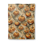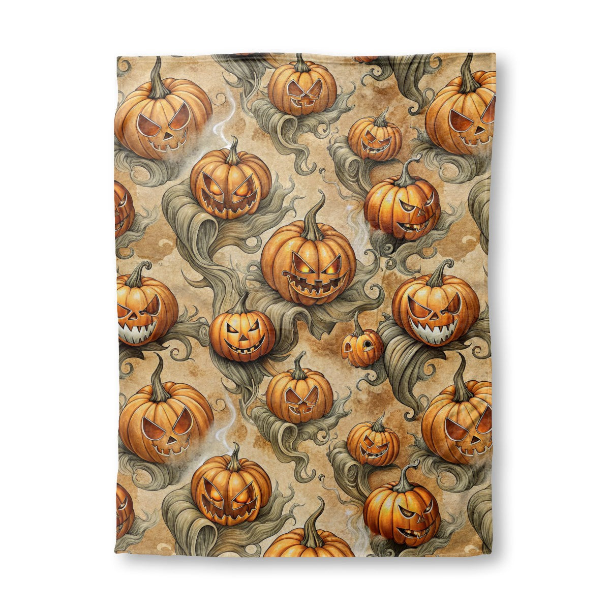 This is a spooky, seamless Halloween pattern of menacing jack-o'-lanterns. Each pumpkin features a unique, glowing, evil face and rests on gnarled, swirling tendrils against a textured, parchment-like background, creating an eerie and festive design.