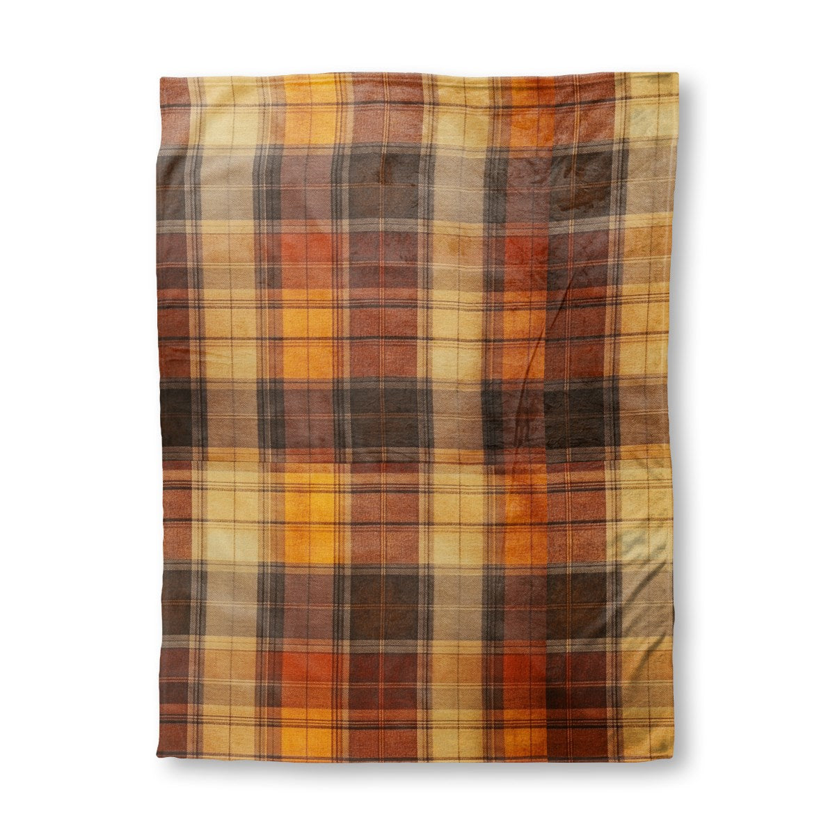 A close-up of a textured plaid fabric in a warm, autumnal color palette. The classic tartan pattern features intersecting stripes of brown, orange, mustard yellow, and beige, creating a cozy and rustic look.