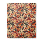 This stylized, artistic pattern features autumnal branches with leaves in rich reds, oranges, and deep purples. Clusters of round berries are scattered throughout the warm-toned foliage, set against a pale, textured background, creating a classic, decorative composition reminiscent of Japanese screen painting.