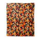 A stylized, abstract pattern of overlapping autumn leaves fills the frame. A rich, warm palette of orange, red, and brown is contrasted by deep blues and dark greens, creating a dynamic, mosaic-like texture reminiscent of stained glass.