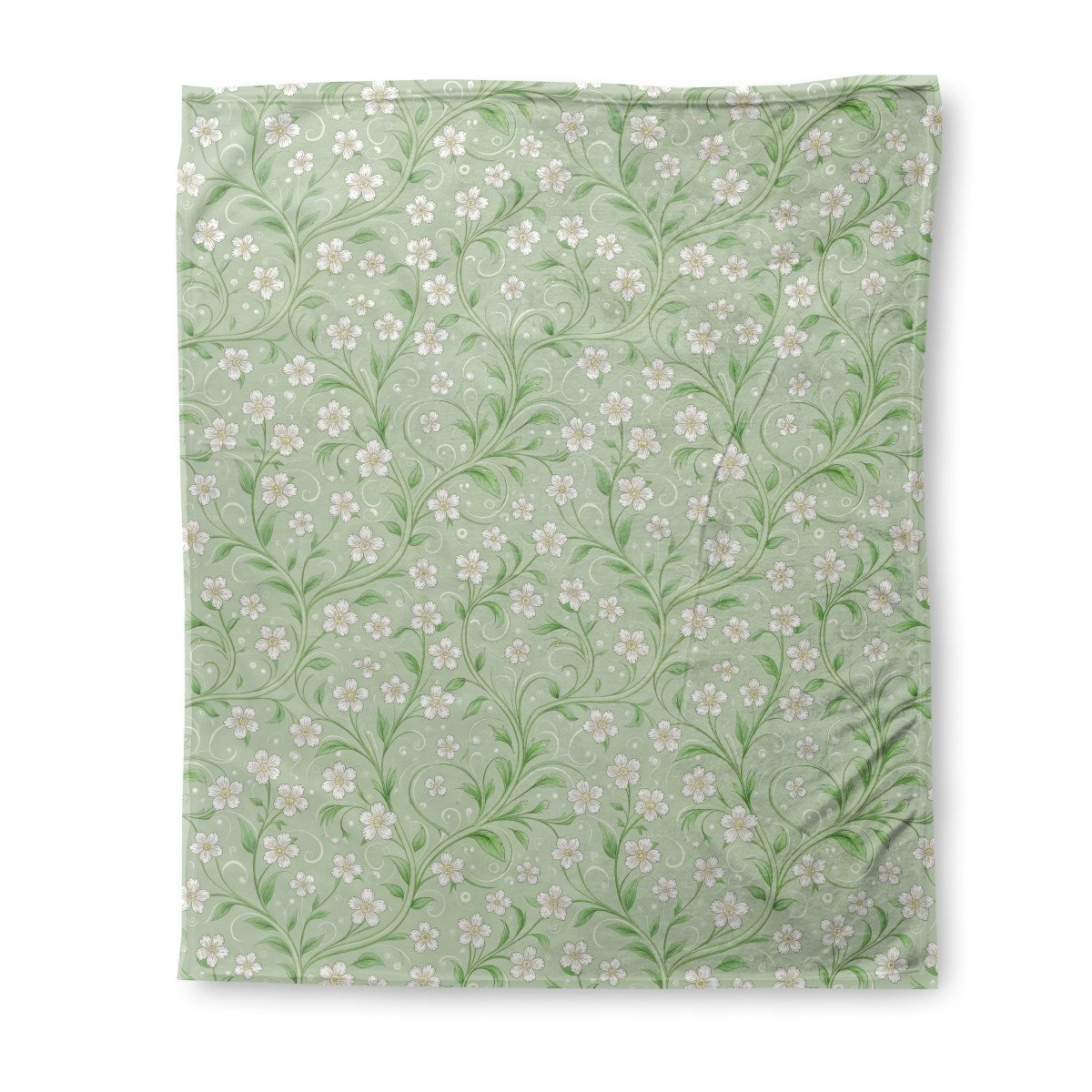 A vintage-style seamless pattern featuring delicate white flowers on gracefully swirling green vines. The intricate, elegant design is set against a soft, muted sage green background with subtle decorative swirls, creating a classic and serene composition.