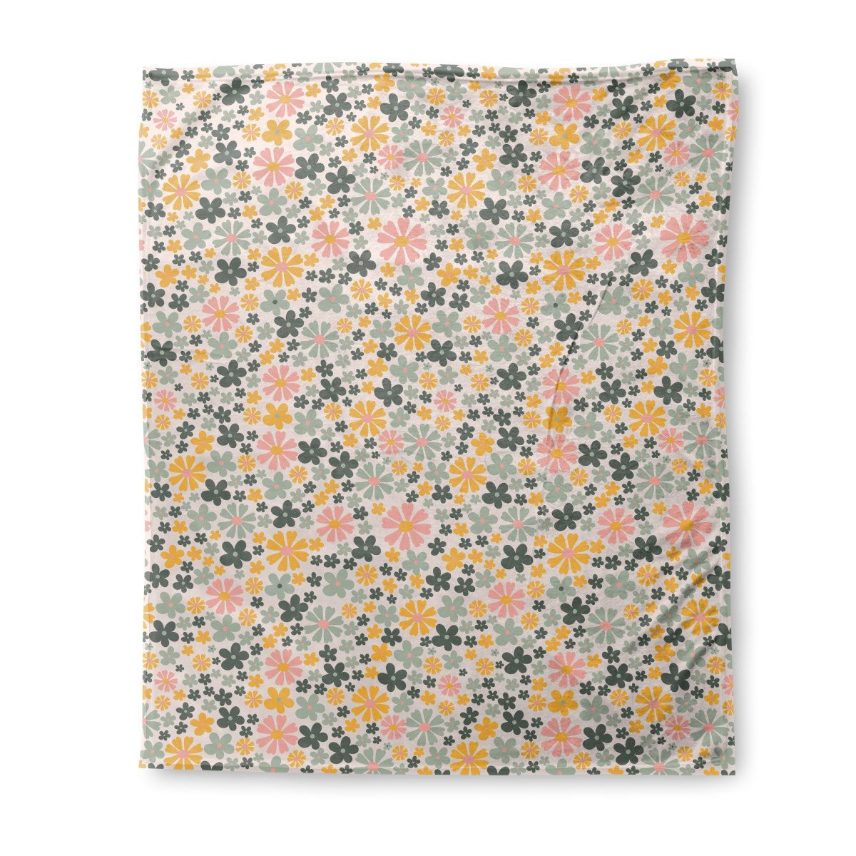 A retro-inspired, seamless pattern of stylized flowers. The ditsy floral print uses a muted color palette of pink, mustard yellow, sage, and dark green against a cream background, creating a groovy, 1970s aesthetic.