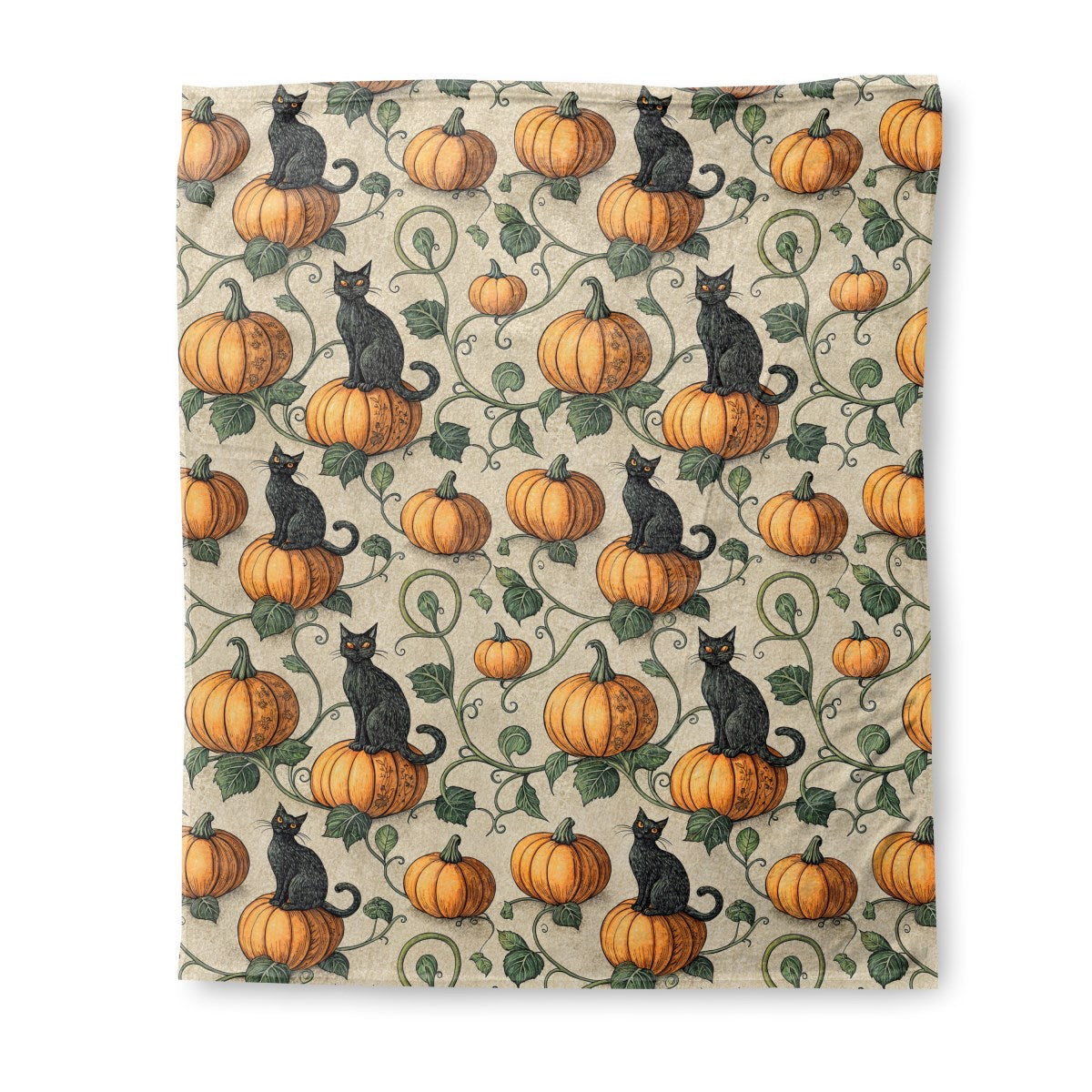 A vintage-style seamless pattern features black cats with glowing orange eyes perched on pumpkins. Swirling green vines and leaves connect the elements on a textured, light background, creating a classic Halloween-themed illustration with a slightly spooky feel.