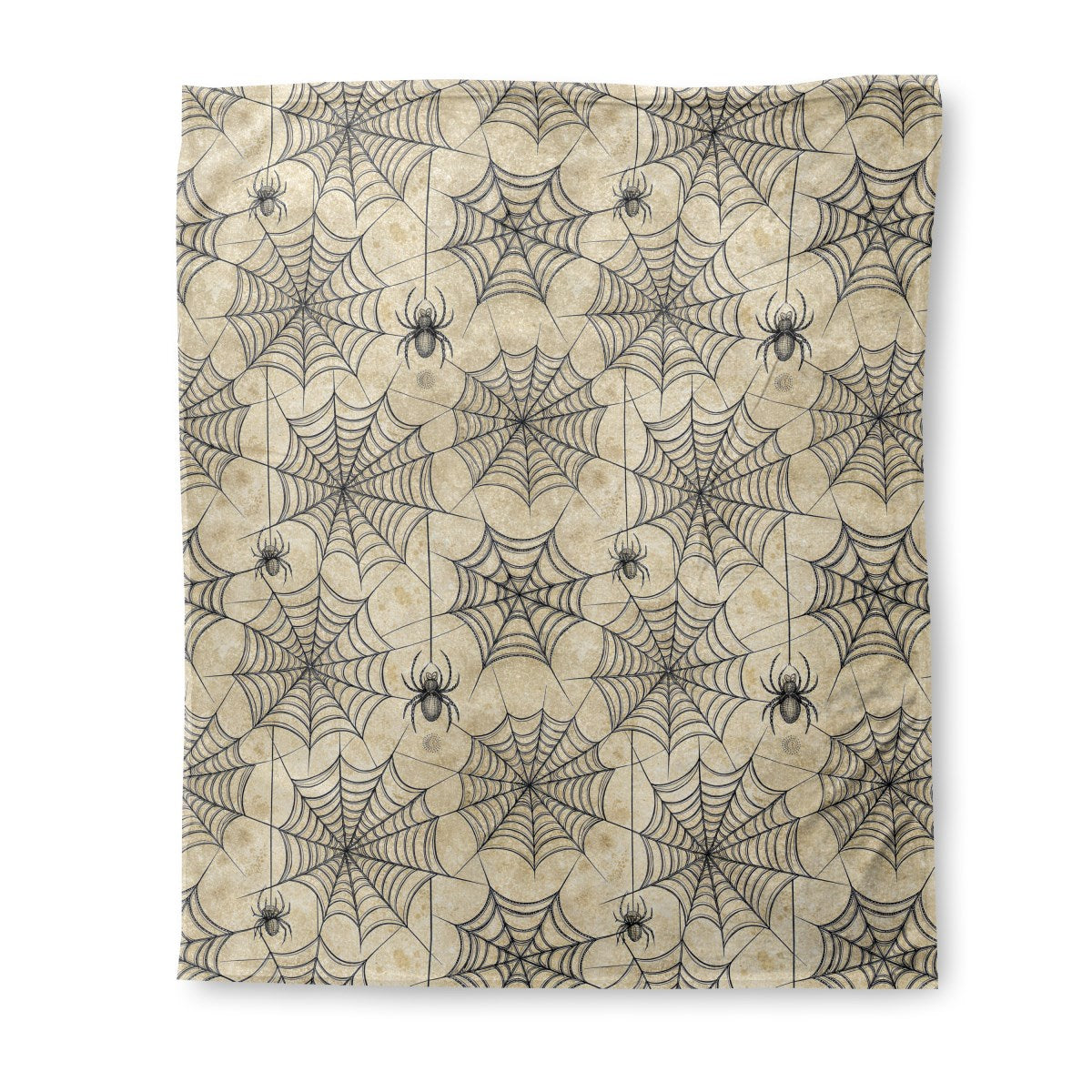 This vintage-style illustration features an intricate, repeating pattern of black spiderwebs on a textured, parchment-like background. Two detailed spiders are present, one crawling on a web and another dangling from a thread, creating a classic spooky or Halloween-themed design.