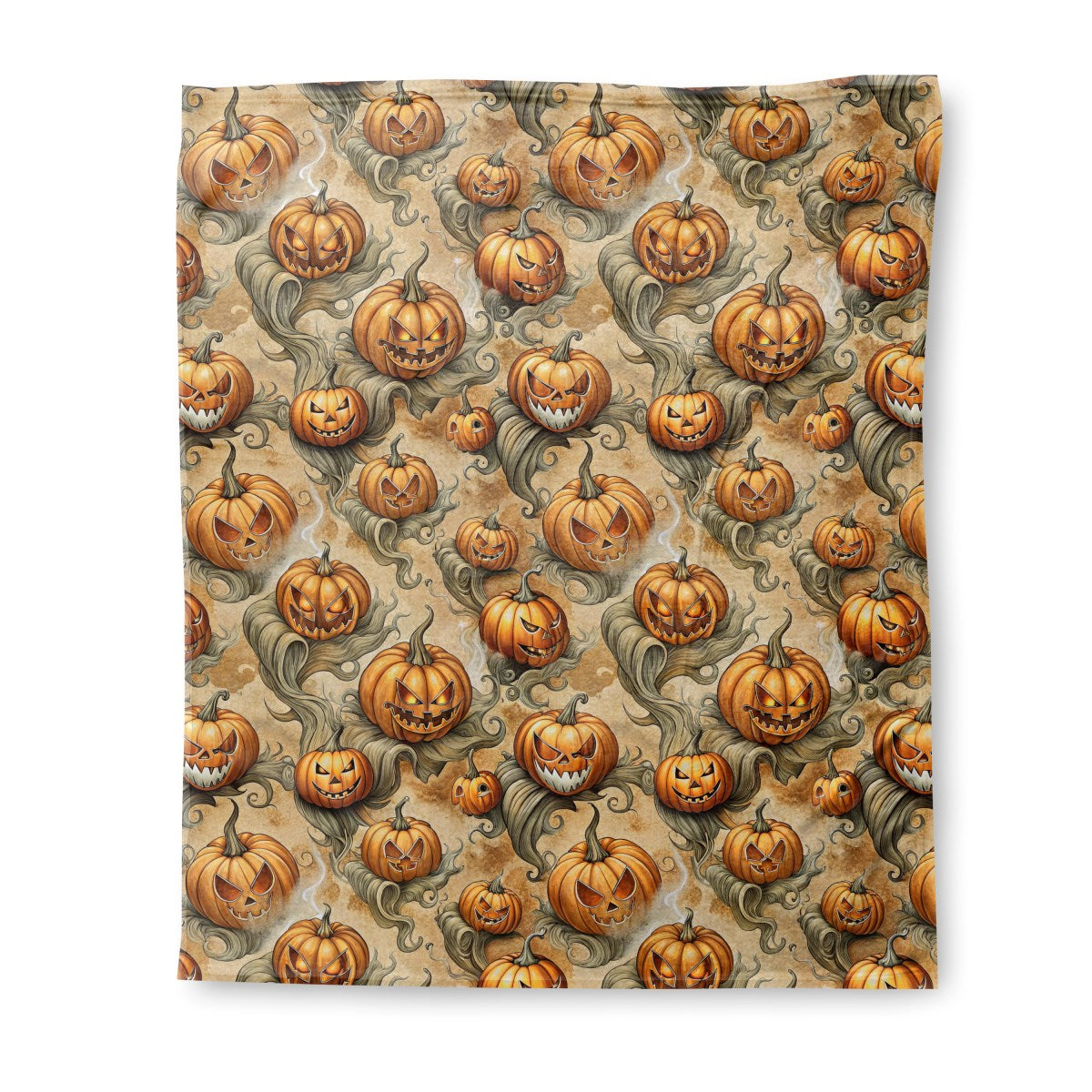 This is a spooky, seamless Halloween pattern of menacing jack-o'-lanterns. Each pumpkin features a unique, glowing, evil face and rests on gnarled, swirling tendrils against a textured, parchment-like background, creating an eerie and festive design.