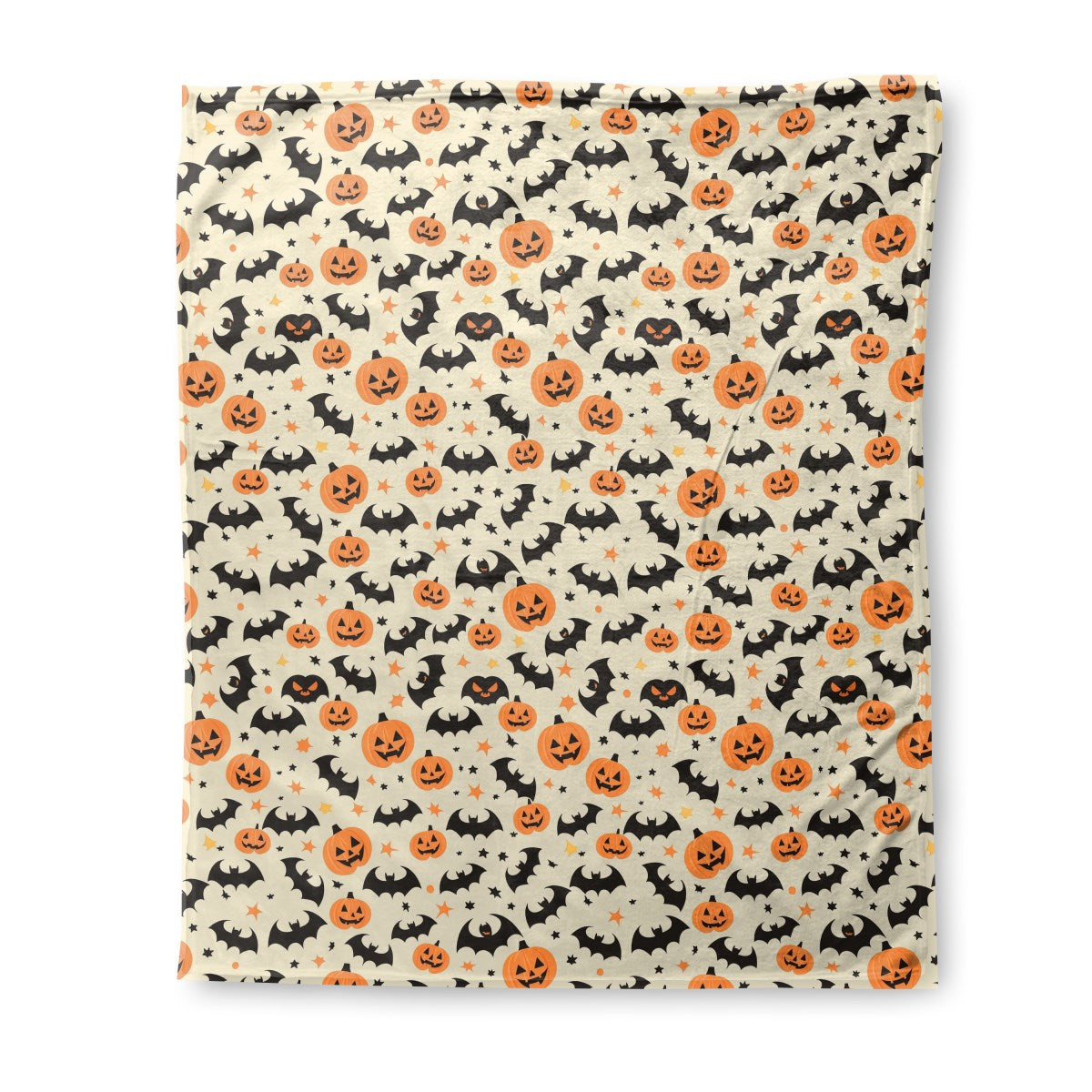 A cheerful, seamless Halloween pattern featuring smiling jack-o'-lanterns, black bat silhouettes, and small stars. The festive cartoon design is set against a light cream-colored background, creating a fun and spooky theme.