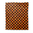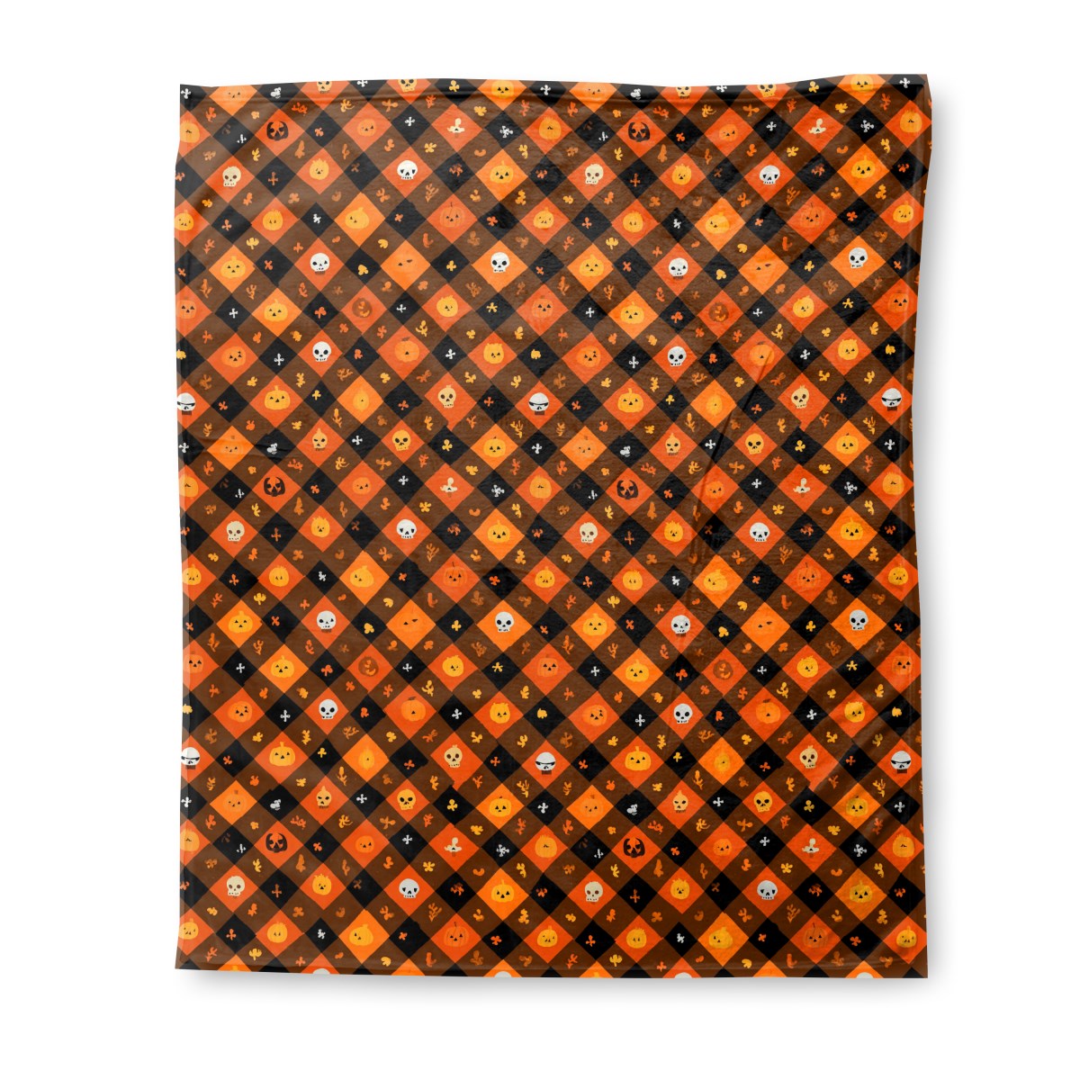 A whimsical, seamless Halloween pattern featuring a diagonal plaid in orange, black, and brown. The design is scattered with hand-drawn, cartoonish skulls, jack-o'-lanterns, and other small autumnal motifs, creating a festive and spooky-cute feel.