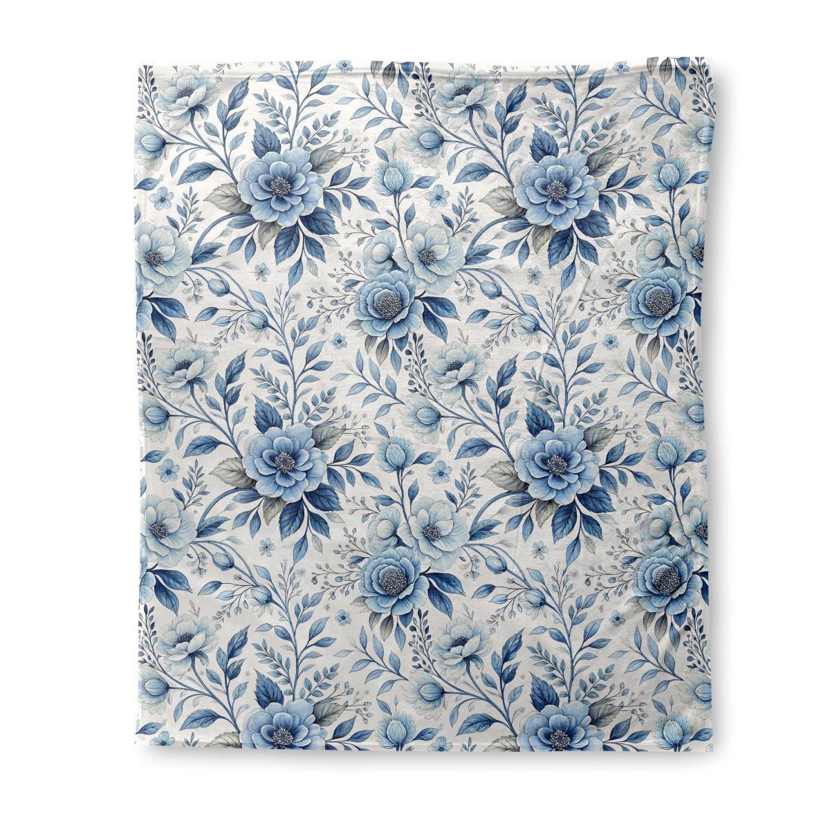 This image displays a seamless floral pattern with elegant, watercolor-style illustrations. Various blue flowers, from light to deep indigo, are intertwined with matching leaves and stems on a clean white background, creating a classic and delicate botanical design.