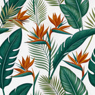 A vibrant, repeating pattern of tropical flora. Striking orange Bird of Paradise flowers bloom amongst lush, deep green palm and banana leaves. The stylized design is set against a clean white background, creating a bold and classic botanical print.