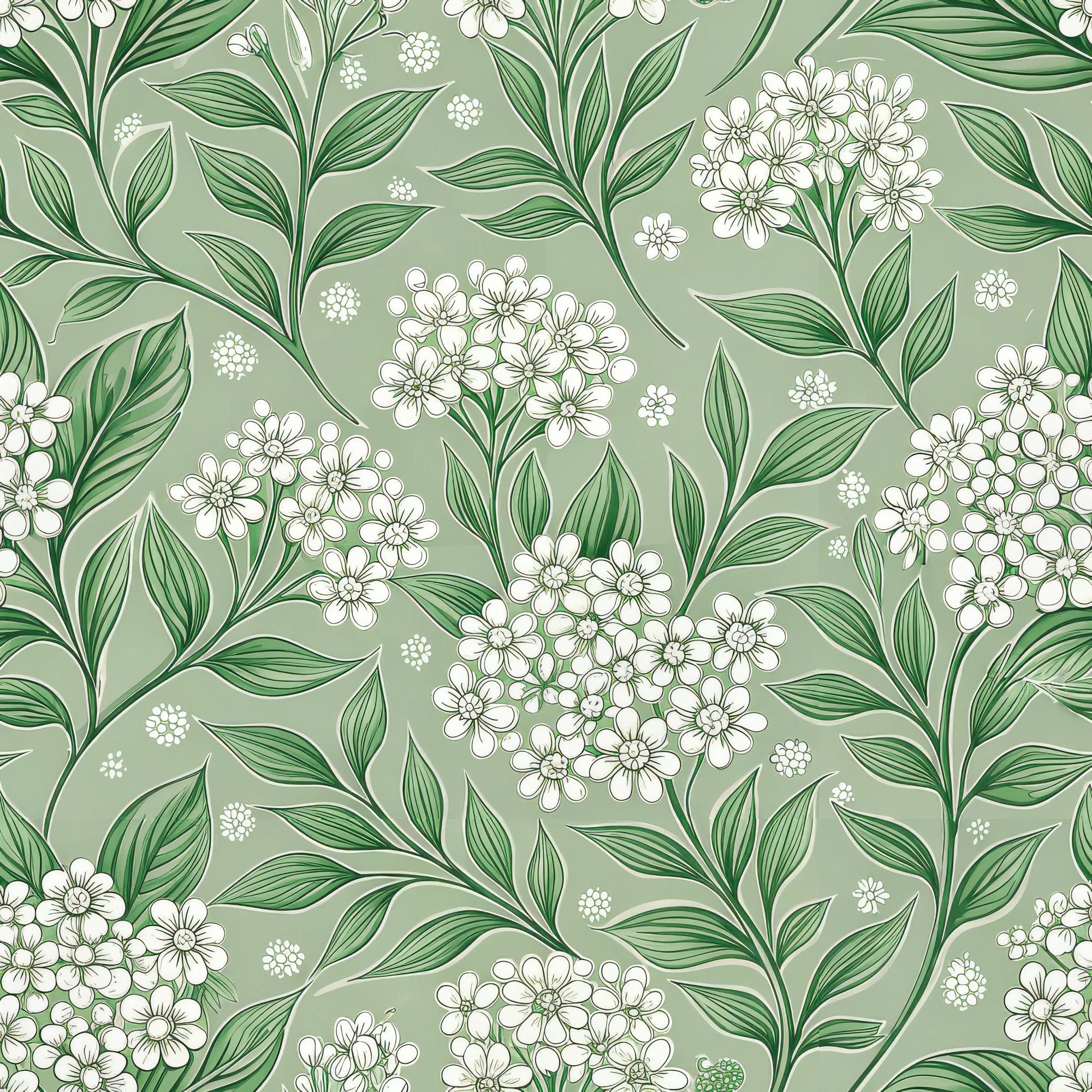 This is a seamless botanical pattern featuring elegant clusters of small white flowers and detailed green leaves. The graceful, curving stems are set against a soft sage green background, creating a classic, vintage-inspired design.