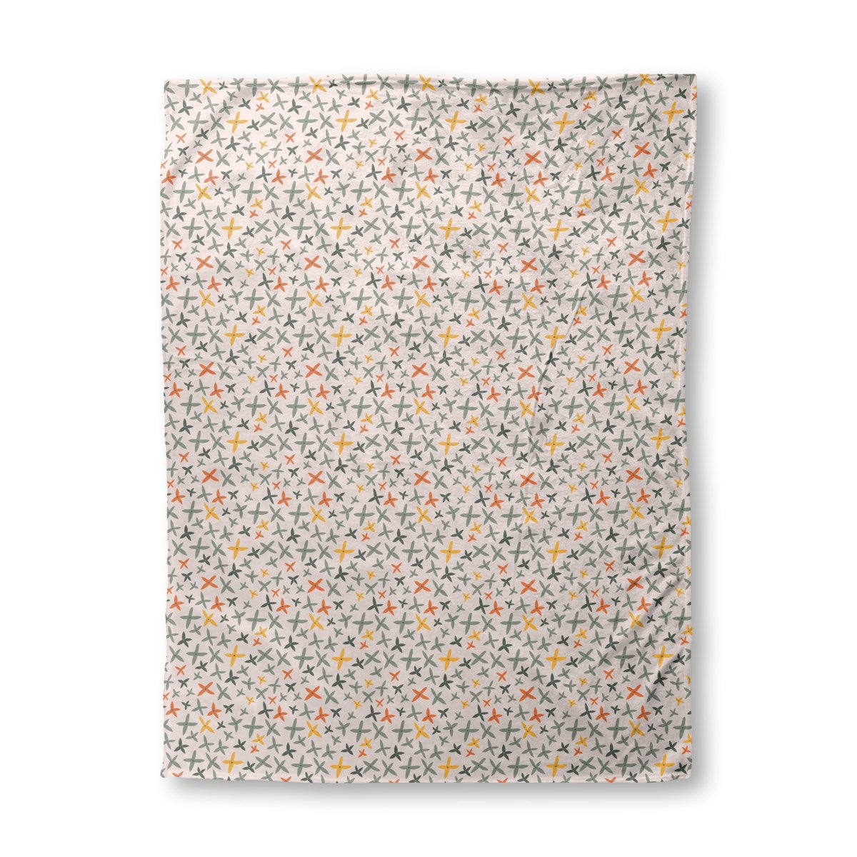 A seamless, modern pattern of stylized four-petaled flowers in varying sizes. The design features a muted, earthy color palette of green, orange, and yellow scattered playfully across a light, off-white background for a whimsical and abstract look.