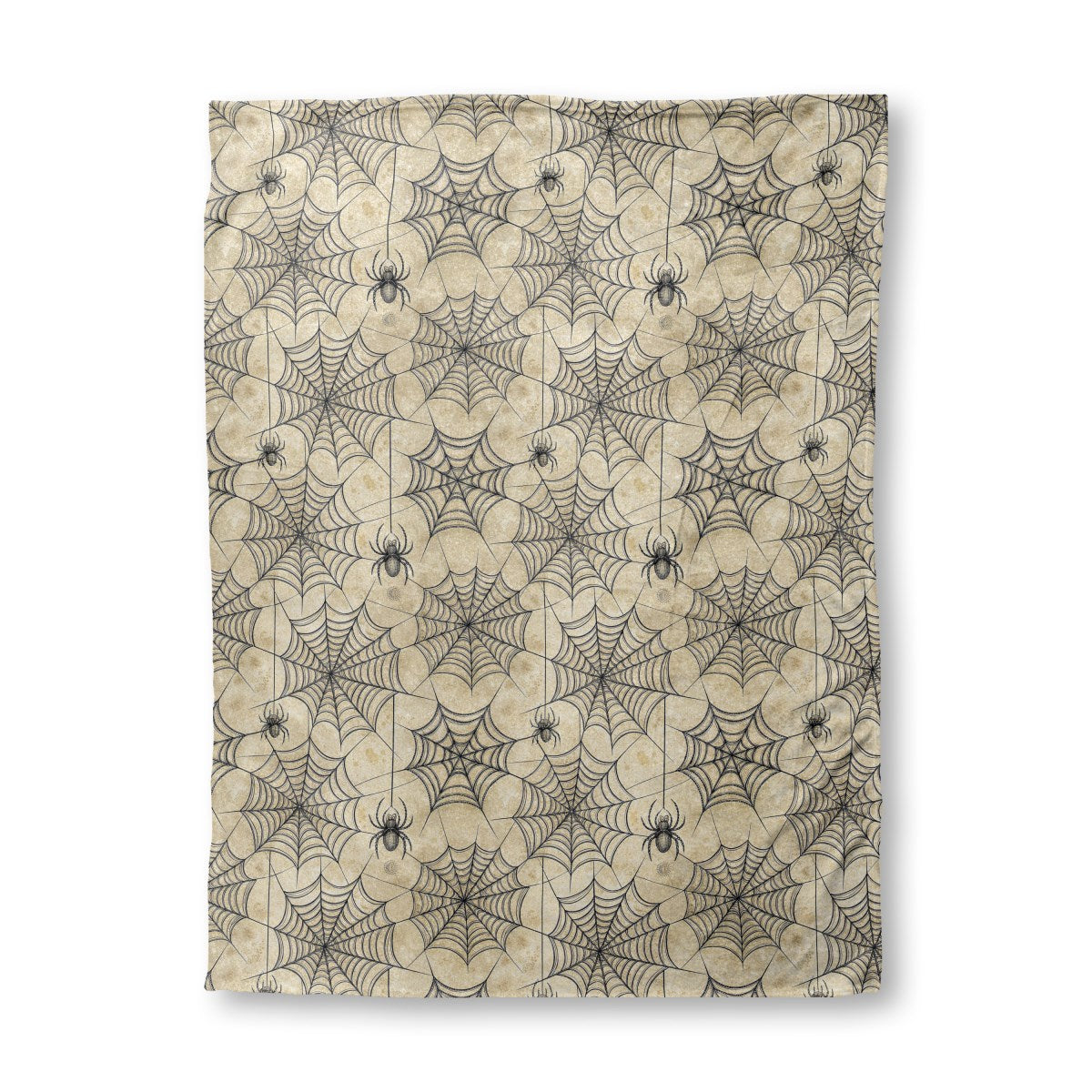 This vintage-style illustration features an intricate, repeating pattern of black spiderwebs on a textured, parchment-like background. Two detailed spiders are present, one crawling on a web and another dangling from a thread, creating a classic spooky or Halloween-themed design.