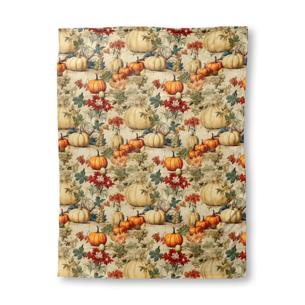 A vintage-style illustration of a bountiful autumn harvest. Orange and pale pumpkins, grapes, and colorful foliage are arranged on tiered stone ledges, creating a rich, decorative pattern with a classic, botanical feel.