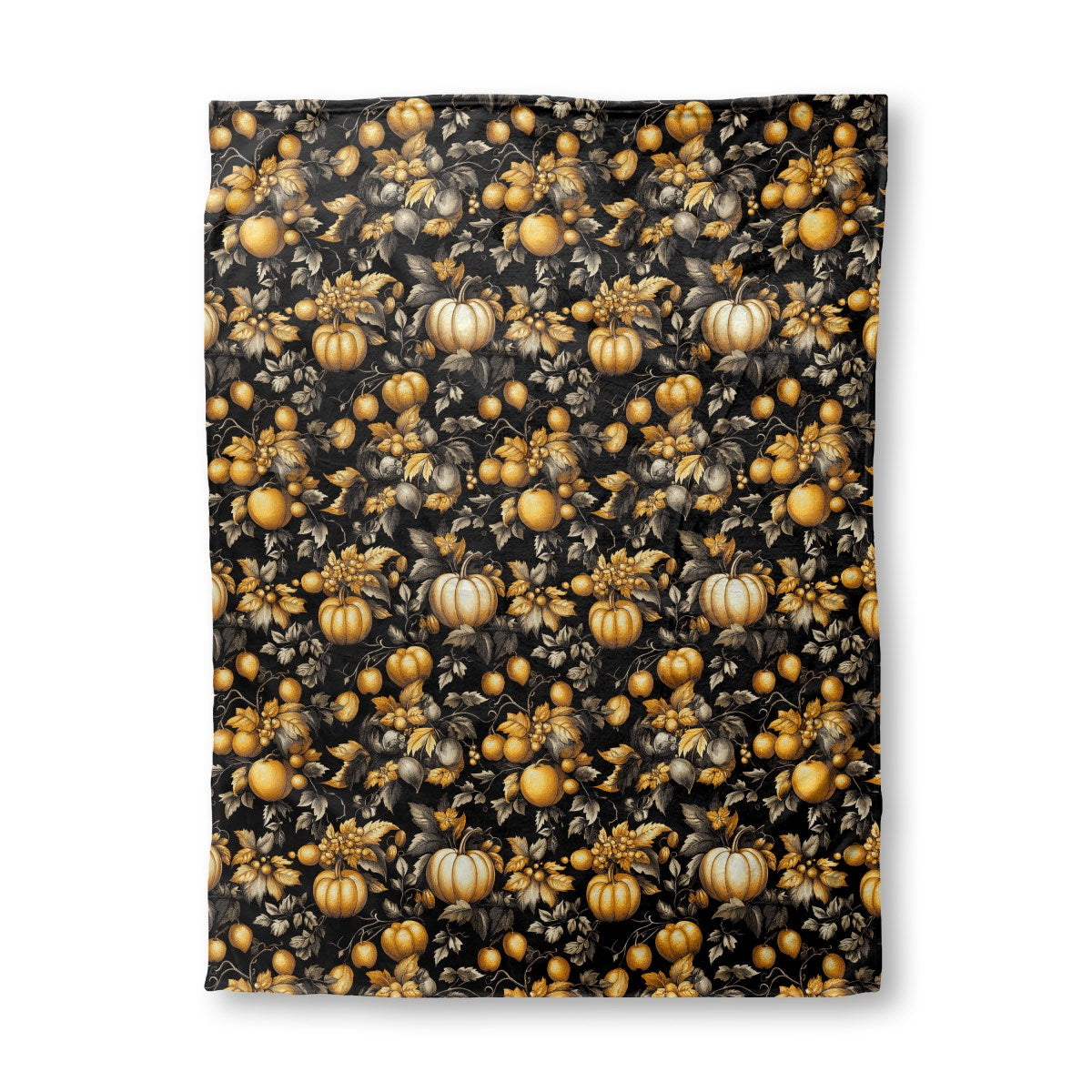 A luxurious, vintage-style pattern of autumnal fruits and foliage. Rendered in a detailed engraving style, golden pumpkins, apples, and grapes contrast richly with silver-toned leaves against a dramatic black background, creating an opulent and seamless design.