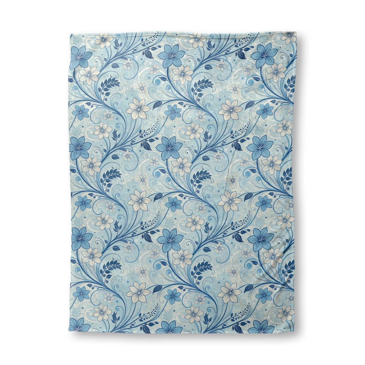 An elegant, seamless pattern of stylized flowers and swirling vines. The intricate design features a classic color palette of blue, navy, and cream against a light blue background, creating a delicate and decorative composition.