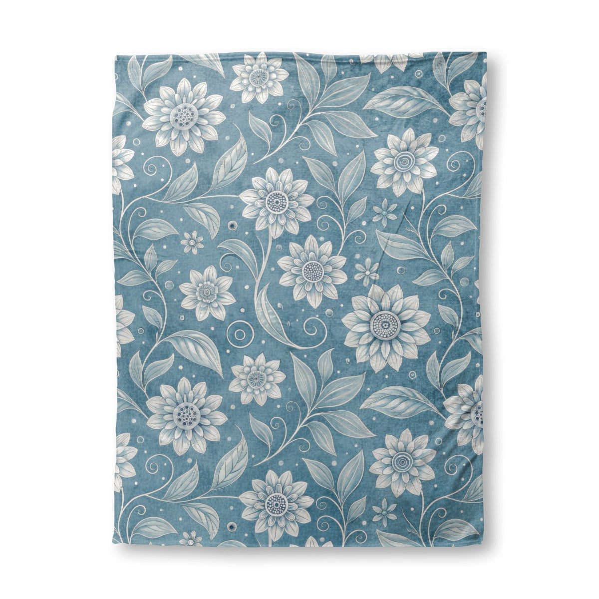 This is a seamless, monochromatic floral pattern featuring stylized white and gray flowers with swirling stems and leaves. Set against a textured, muted blue background, the elegant design has an intricate, embossed quality, giving it a vintage, decorative appearance.