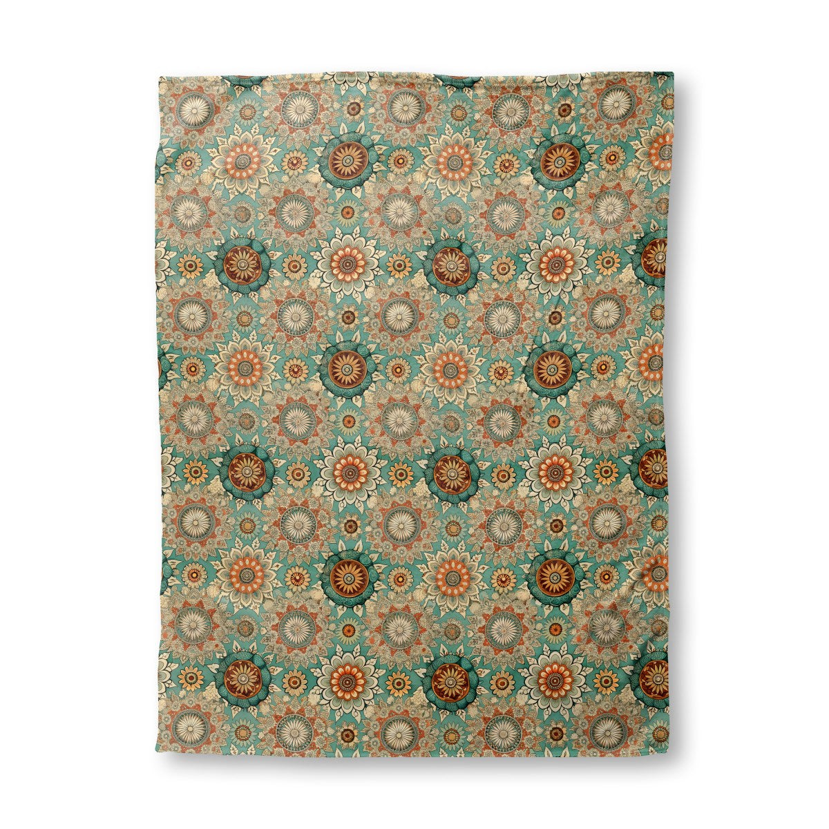 A vintage-style seamless pattern of intricate floral mandalas in a bohemian style. The design features a warm, earthy palette of orange, rust, and cream against a muted teal background, evoking the look of traditional block prints.