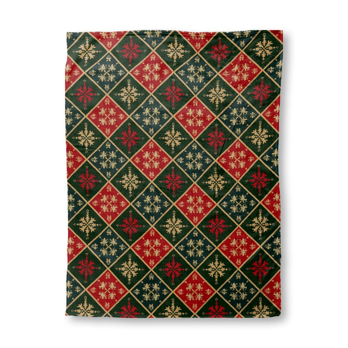 A festive, knitted textile pattern featuring red, green, and dark blue diamonds outlined in gold. Each diamond contains intricate snowflake motifs, evoking the cozy feel of a traditional Christmas sweater or tapestry.
