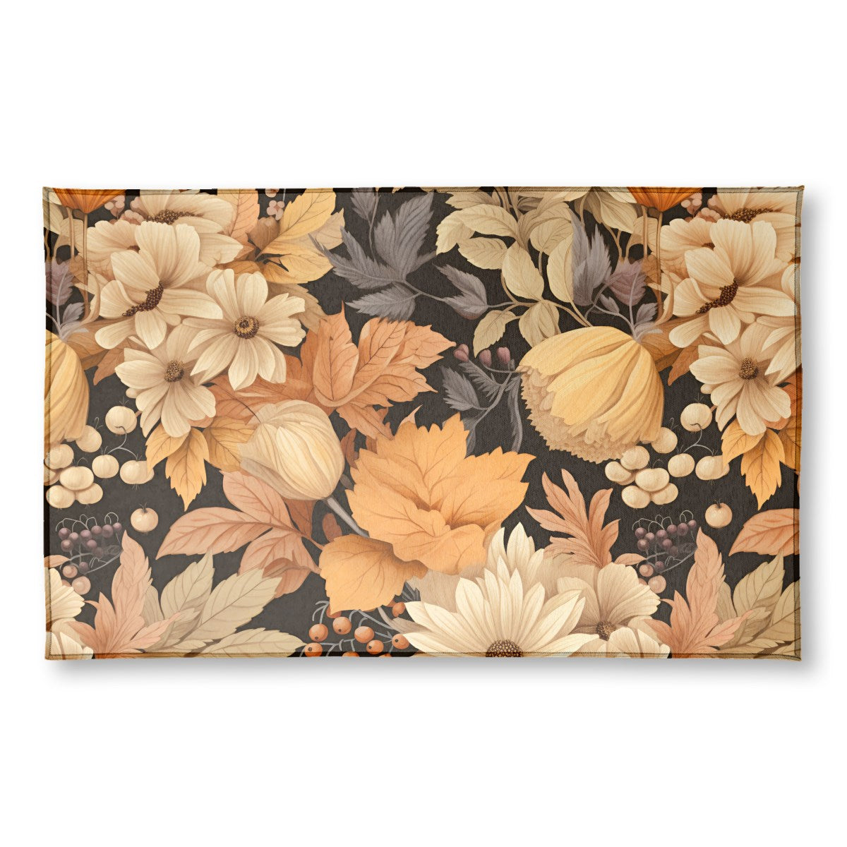 This is a seamless botanical pattern featuring autumn flora. A warm palette of orange, cream, and muted tones for flowers, leaves, and berries is set against a dark background, creating a rich, elegant, and vintage-inspired design with a cozy, autumnal feel.