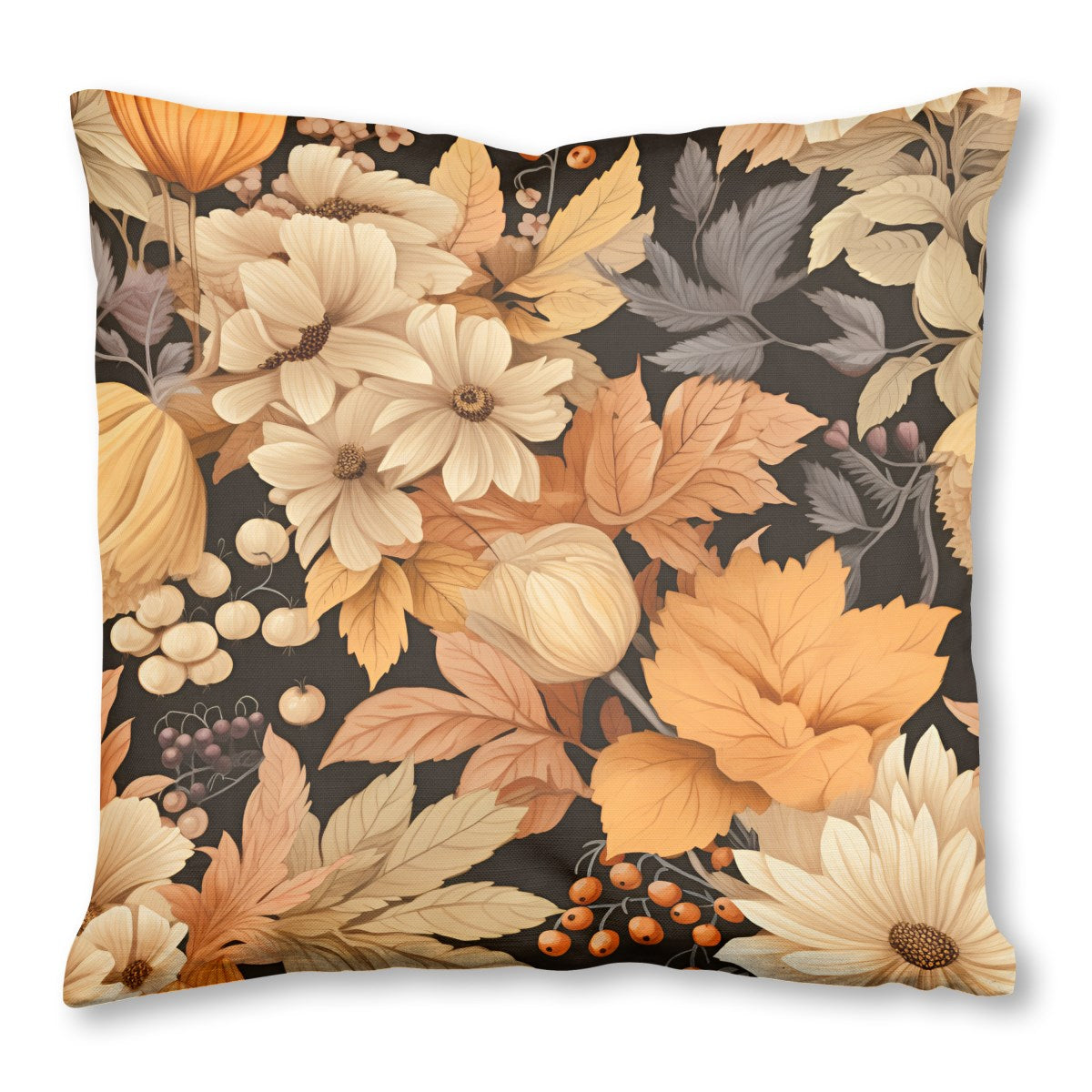 This is a seamless botanical pattern featuring autumn flora. A warm palette of orange, cream, and muted tones for flowers, leaves, and berries is set against a dark background, creating a rich, elegant, and vintage-inspired design with a cozy, autumnal feel.